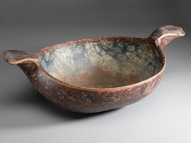 Grote gedraaide houten nap met twee handgrepen, de buitenkant versierd met bloemen, de binnenkant blauw/wit gemarmerd