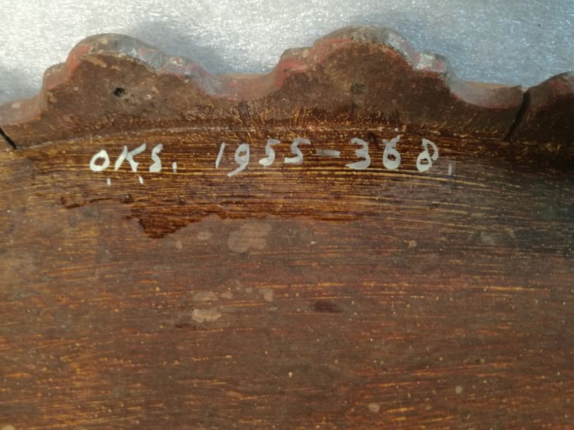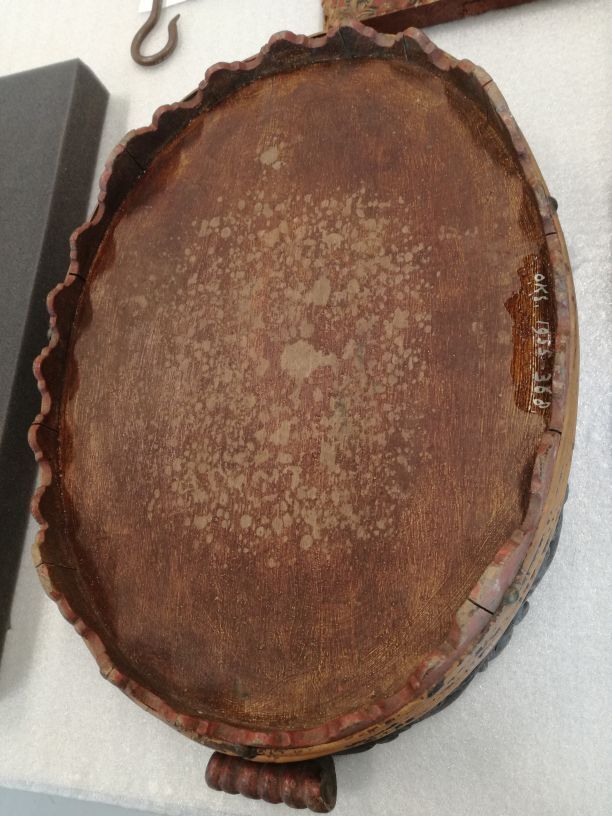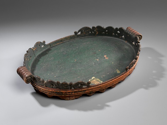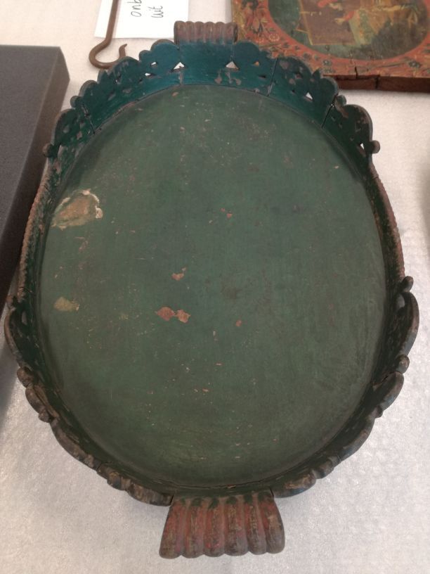Ovaal houten geploychromeerd dienblad of theeblad, met rand versiering van ajour gezaagde krullen