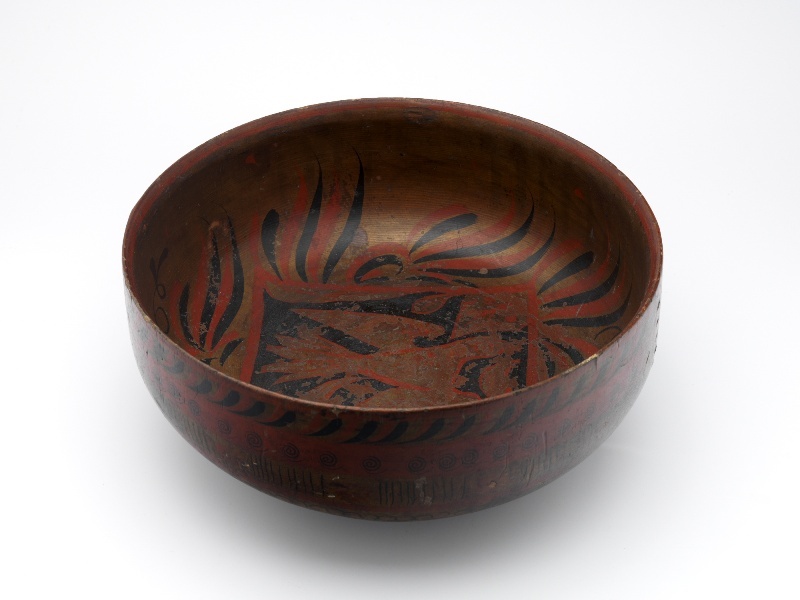 Grote gedraaide houten Riga nap, beschilderd in rood met zwarte streep, spiraal en veeg motieven, met aan de binnekant een vogel