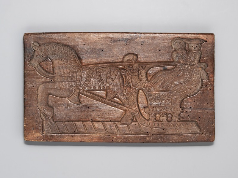 Koekplank, tweezijdig besneden met aan ene zijde een arreslee en op andere een karos/koets met paard