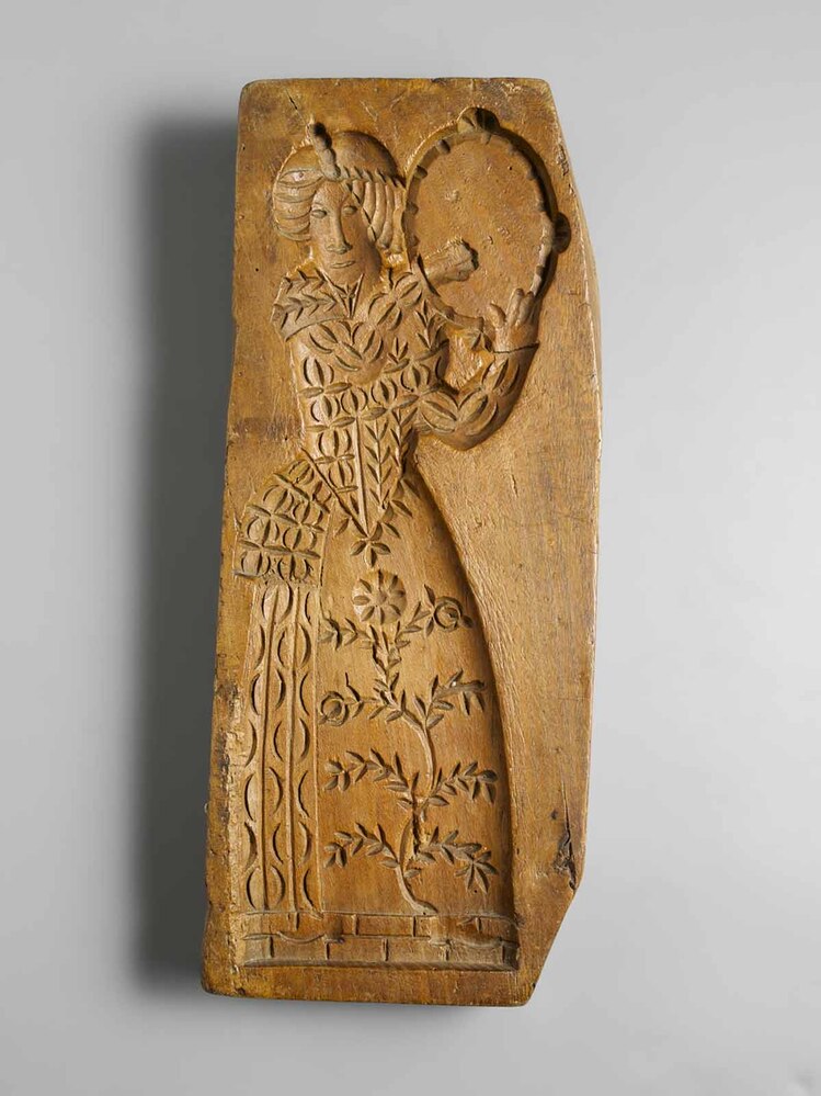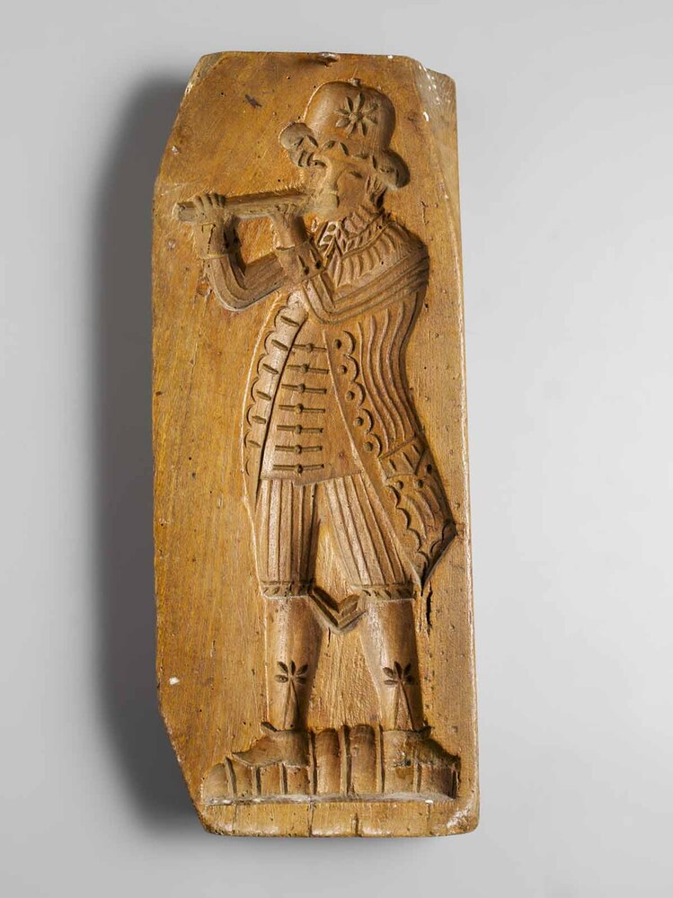 Aan twee zijden besneden koekplank waarop een vrouw en een fluitspelende man, P.D.T.