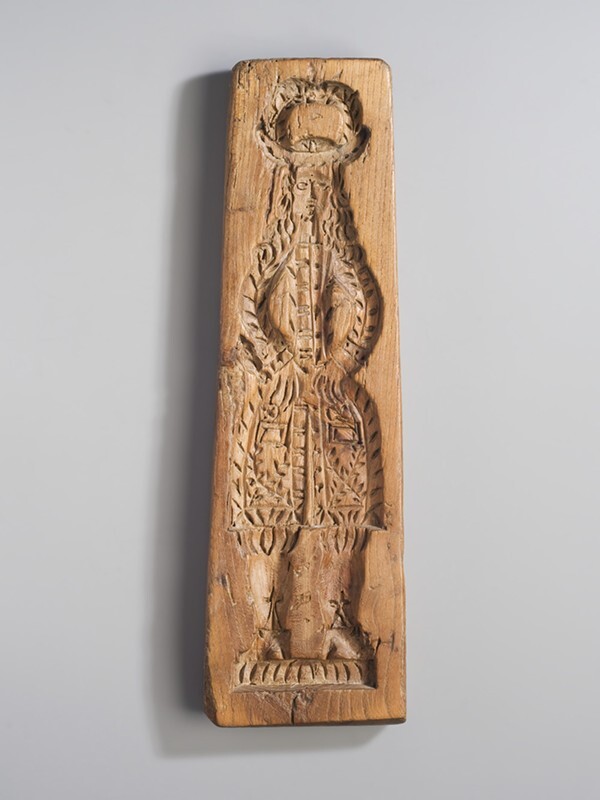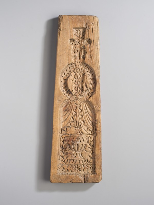 Koekplank, besneden met man en vrouw in 18e eeuwse dracht