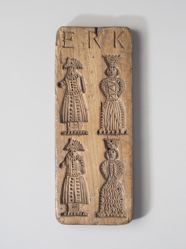 Koekplank, tweezijdig besneden met aan ene zijde zes figuren, aan de andere vier figuren
