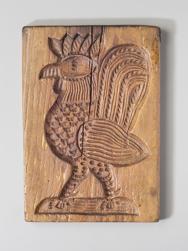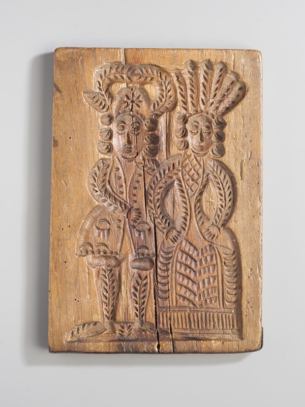 Koekplank, tweezijdig besneden met op de ene zijde een haan en op de andere een man en vrouw in 18e eeuws kostuum