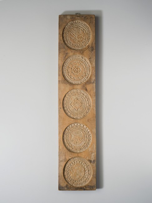 Koekplank, eenzijdig besneden met vijf ronde figuren