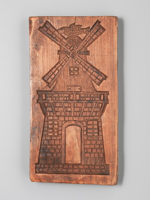 Koekplank met op ene zijde een molen, op andere een koets en ingesneden F.d.H.