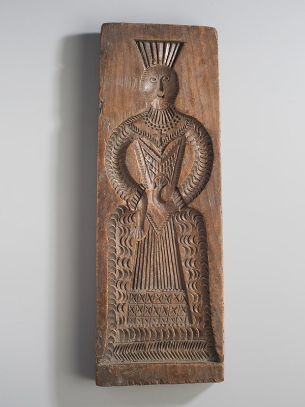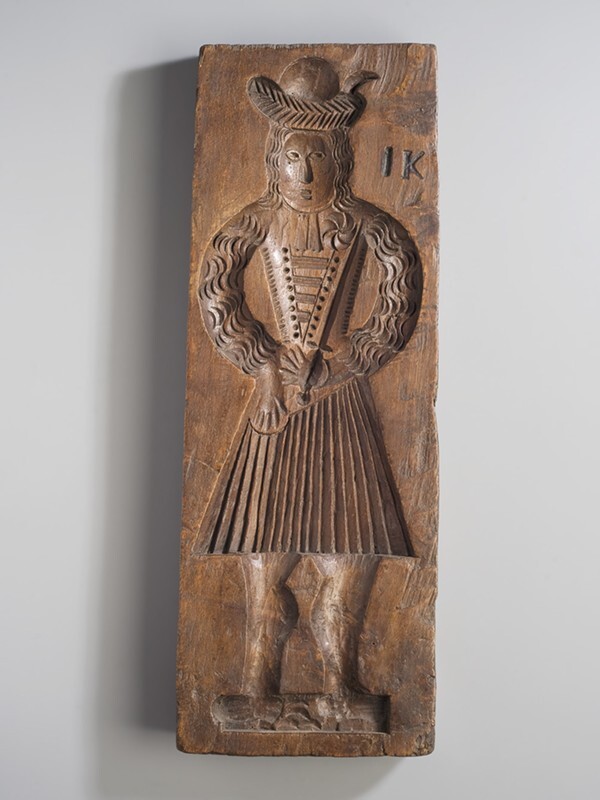 Koekplank, tweezijdig besneden met een man aan de ene zijde en een vrouw met kruisje aan de andere