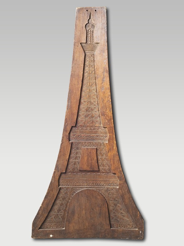Piramidevormige koekplank, met aan de ene kant de Eifeltoren, de andere zijde een ruiter en schaap