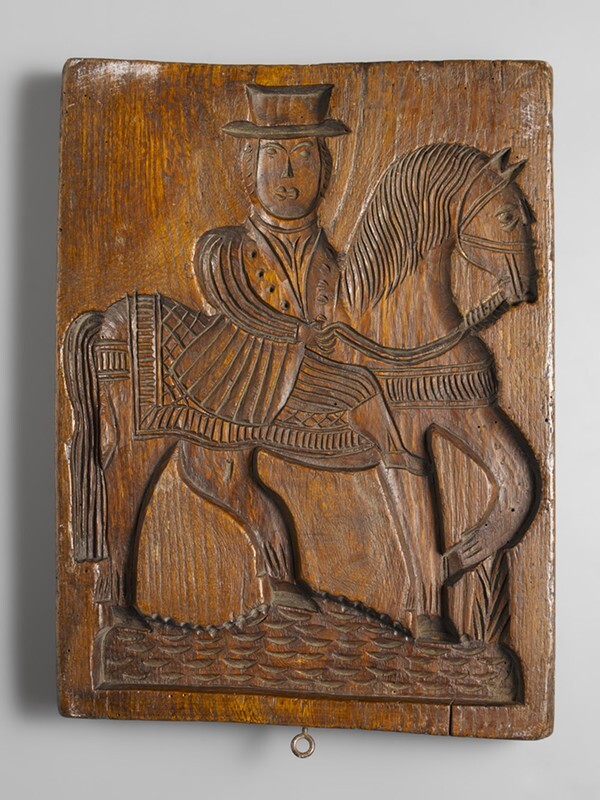 Aan twee zijden besneden koekplank waarop een driemastschip en een ruiter