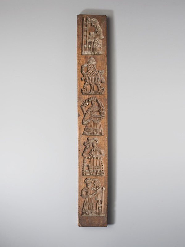 Koekplank, aan beide zijden besneden met vijf figuren, op een zijkant is ingesneden H.I.M.
