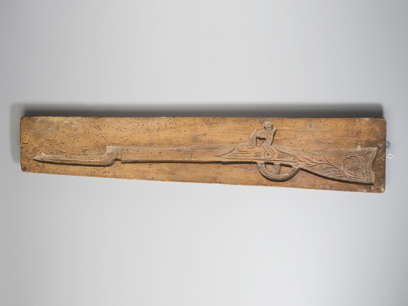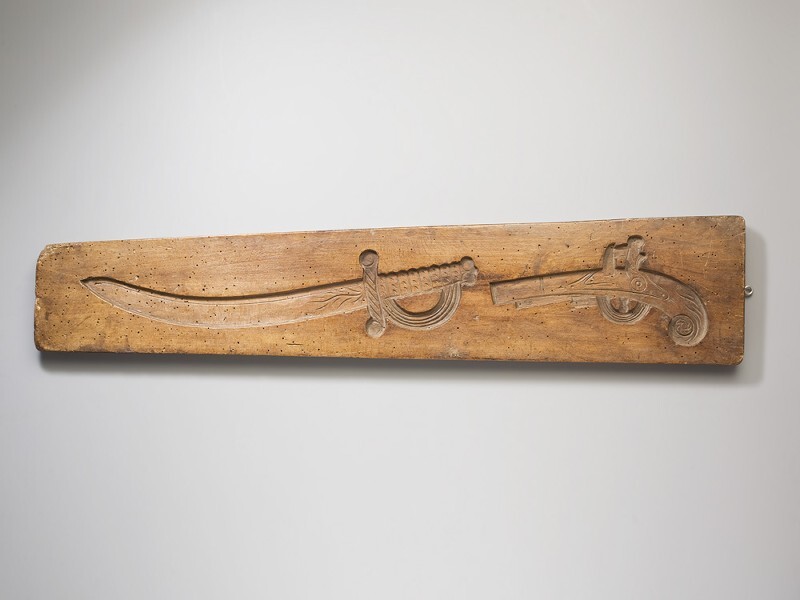 Koekplank, tweezijdig besneden met aan de ene zijde een pistool en kromme sabel, aan de andere zijde een geweer waarop bajonet