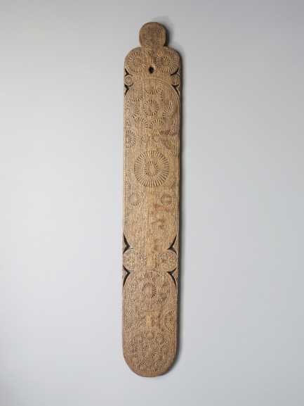 Mangelplank met fijn kerfsneewerk, boven en in het midden van de zijkanten uitsparingen gezaagd