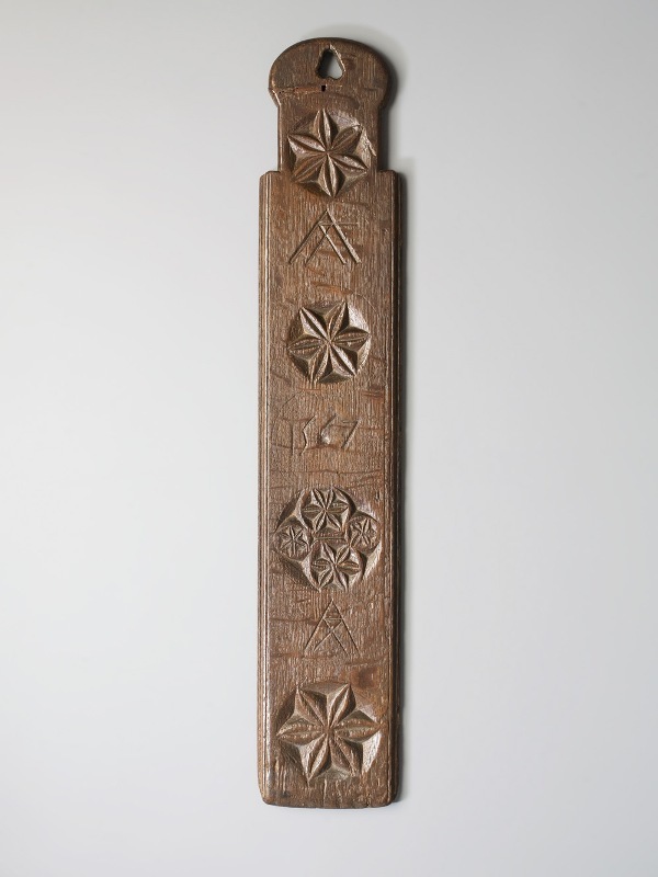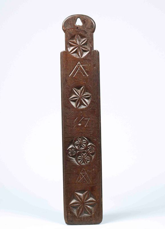 Mangelplank besneden met drie zessterren en een cirkelvorm waarin vier zessterren