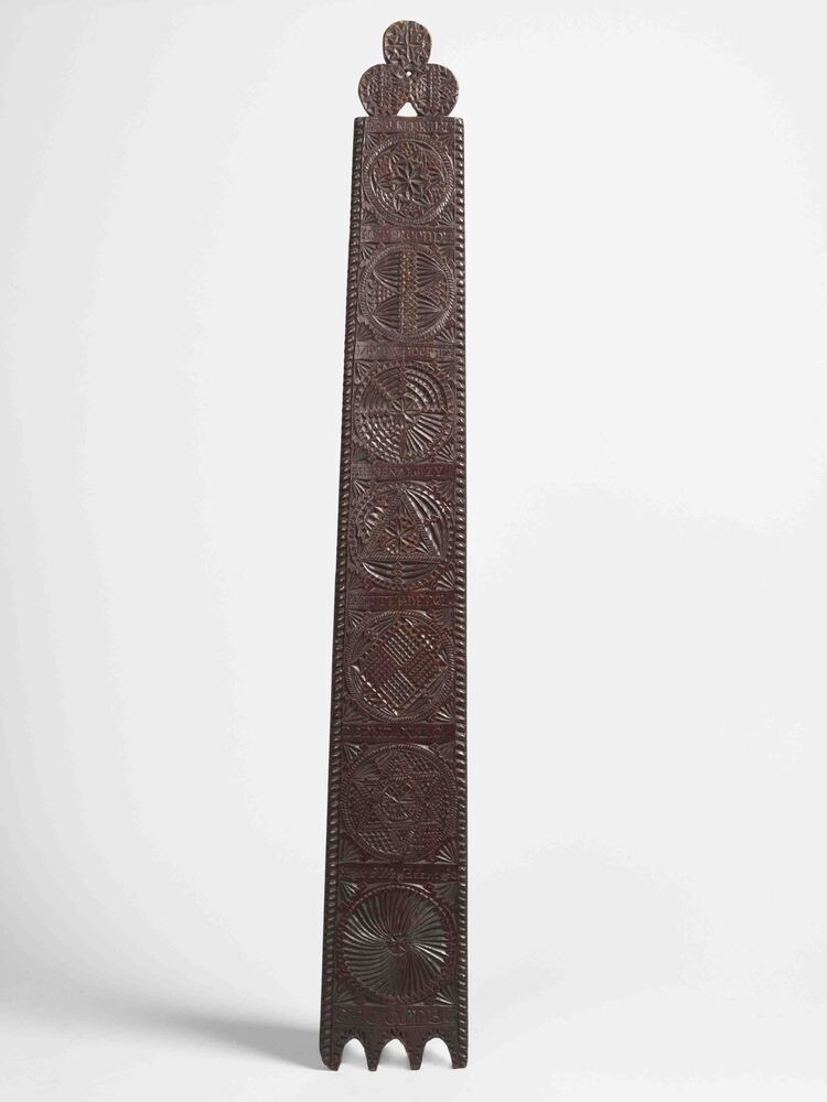 Mangelplank, versierd met kerfsneewerk afgewisseld door acht banden met ingesneden tekst