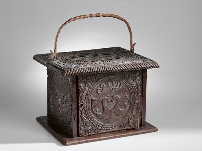 Vierkante stoof met deurtje en in cirkel de letters G D en twee zeepaardjes