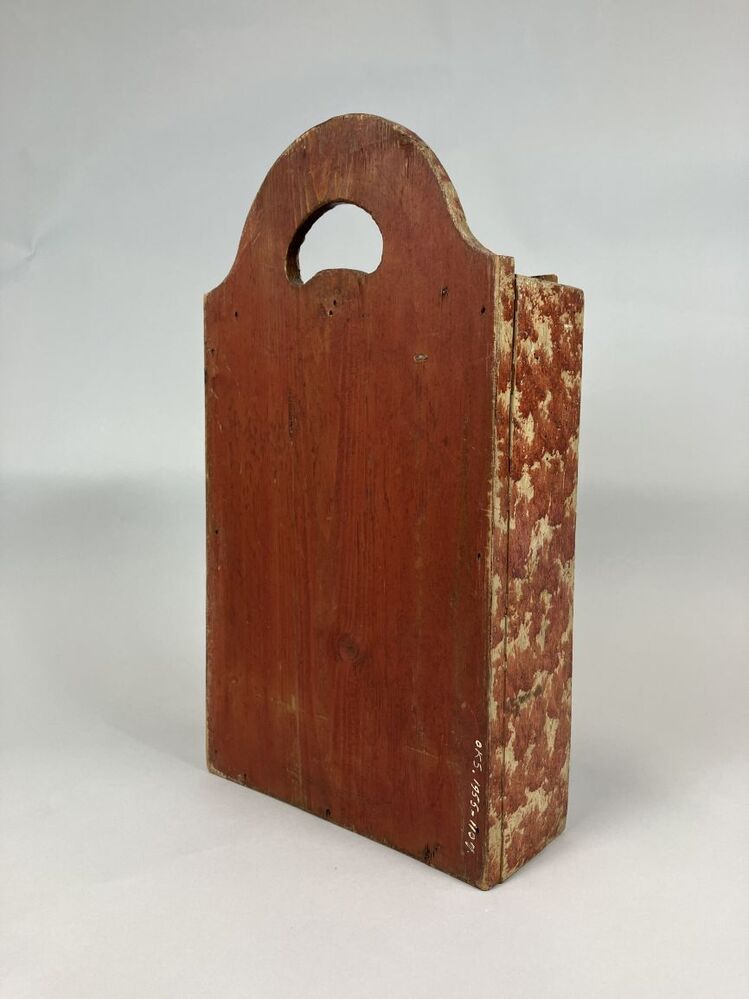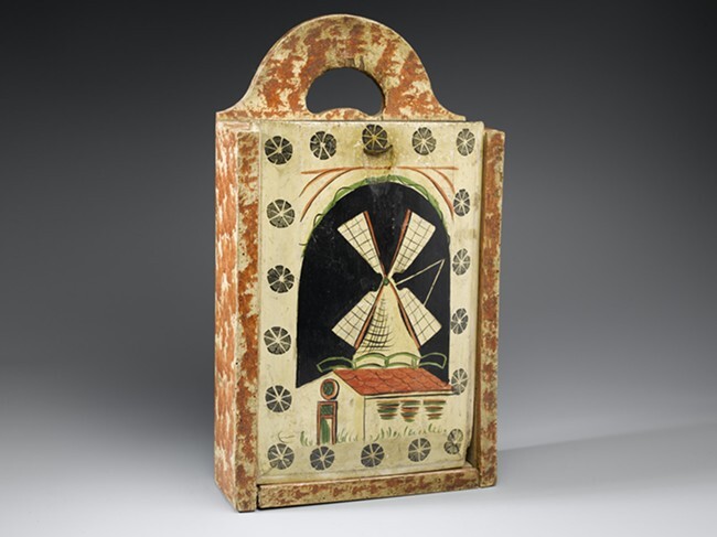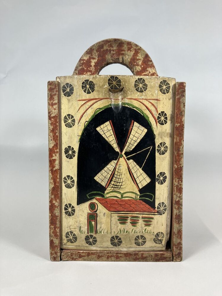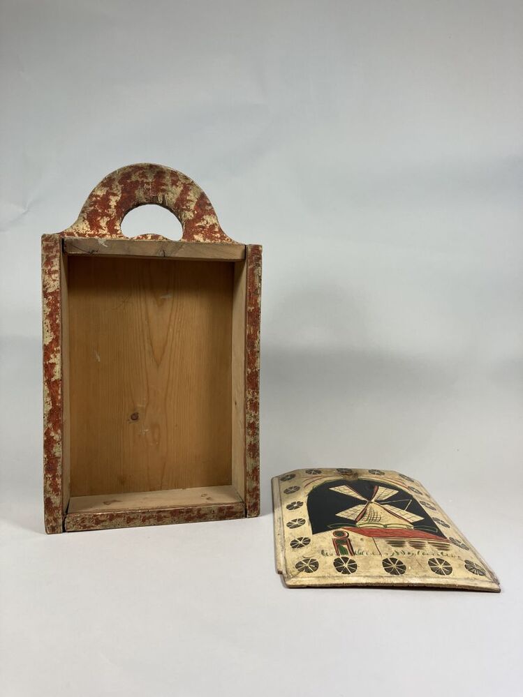 Gepolychromeerde eikenhouten schooltas met op het schuifdeksel een molen