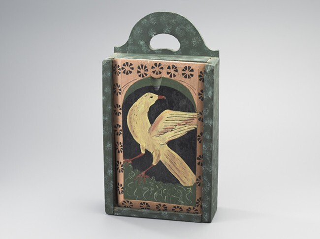 Eikenhouten gepolychromeerde schooltas met op schuifdeksel een zeemeeuw