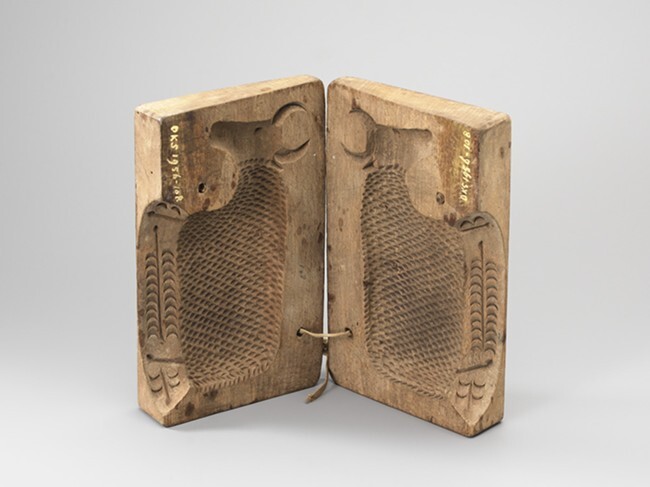 Lindenhouten botervorm bestaande uit twee helften, voorstellende een koe