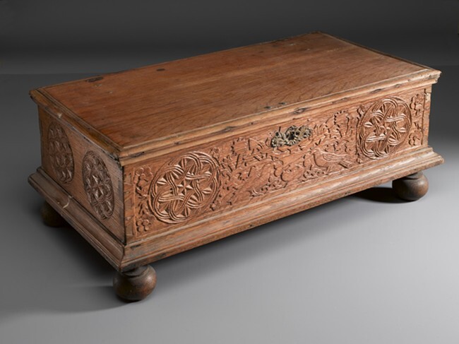 Lichtgekleurde eikenhouten kistje op vier balpoten