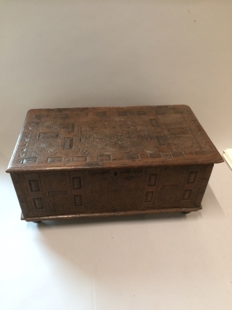 Bruin eikenhouten kistje met scharnierend deksel en rustend op vier gedraaide houten zwart geverfde pootjes