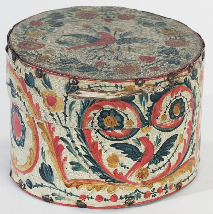 Ronde doos van hout en walvisbalein, beschilderd in Hindelooper trant.
