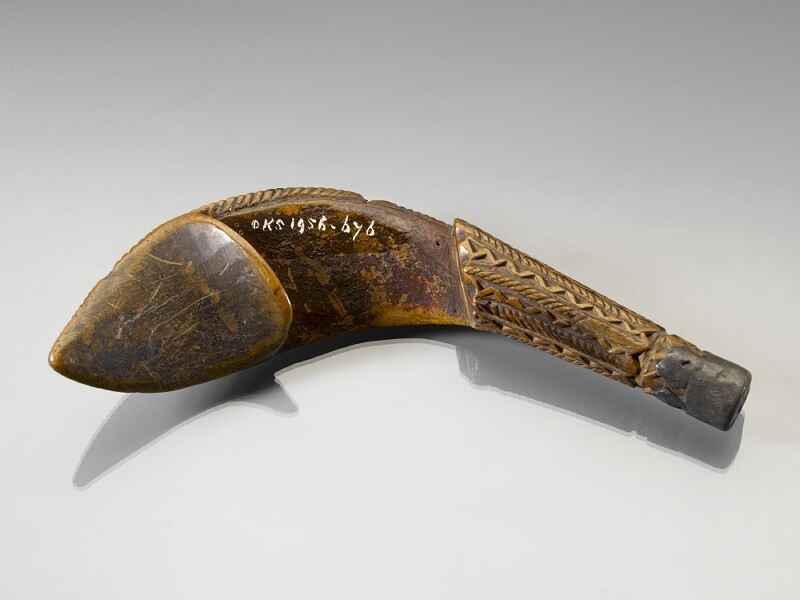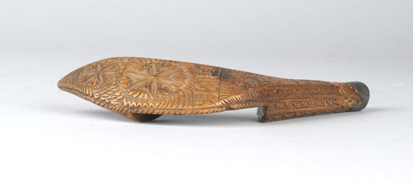 Houten gebogen breischede, versierd met kerfsnee en HP: 1816, de bovenkant is met lood bekleed