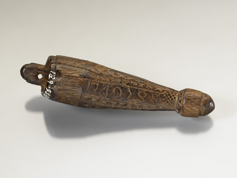 Kokervormige breischede, versierd met kerfsnee o.a. een bloem op steel en 1742 SS