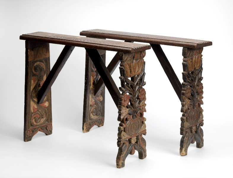 Eén van twee bij elkaar horende schamels, versierd met krullen en vogels