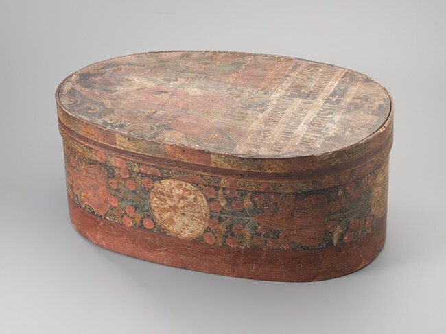 Ovale spanen budde met los deksel waarop geschilderd; twee vrouwen met hoog kapsel op de achtergrond een man, onderaan een tekst