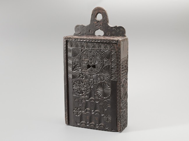 Eikenhouten schooltas met schuifdeksel, versierd met kerfsnee