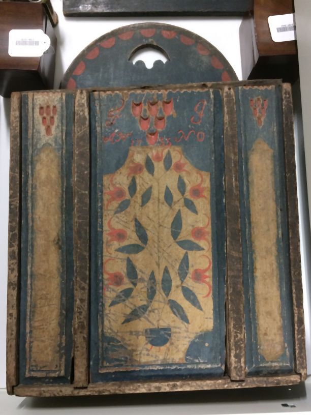 Beschilderd eikenhouten schoolbord met één grote en twee kleine schuifdeksels en opschrift: F.I. Anno 1755.
