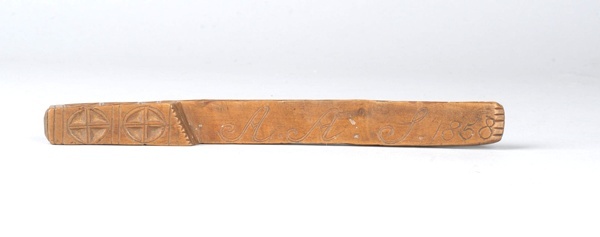 Houten breischede met kerfsnijwerk versierd en de initialen A.A.S. en jaartal 1858
