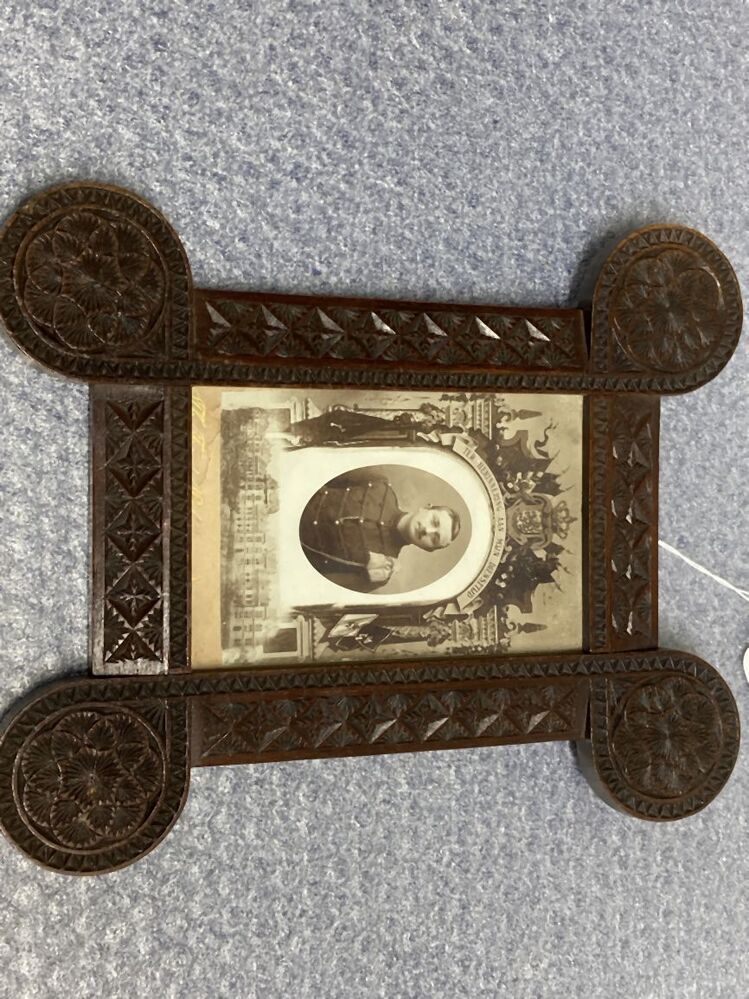 Portretlijstje van eikenhout versierd met kerfsnijwerk met foto van een militair