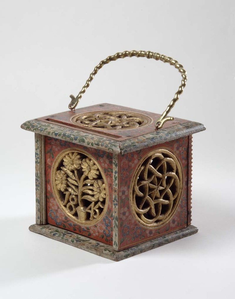 Stoof in Hindelooper kleuren beschilderd, op het losse voorschuifje een levensboom