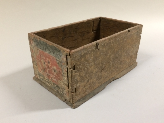 Eikehouten kistje zonder deksel met op de voorkant is het wapen Van Cammingha van Jelmera geschilderd