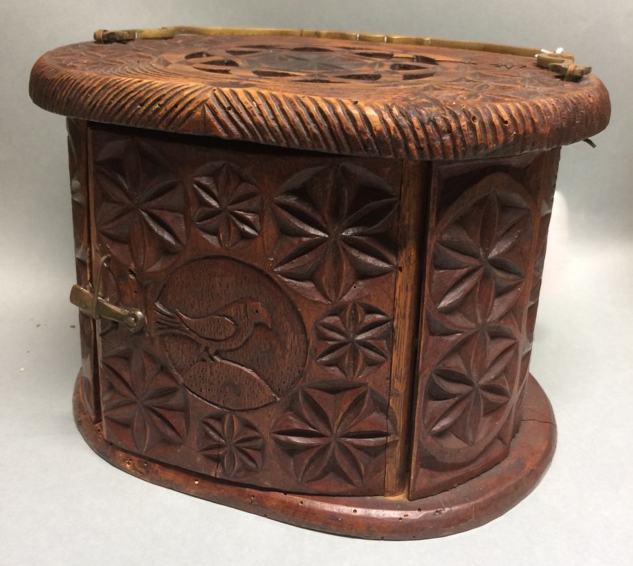 Ovale besneden houten stoof met deurtjes en messing hengsel