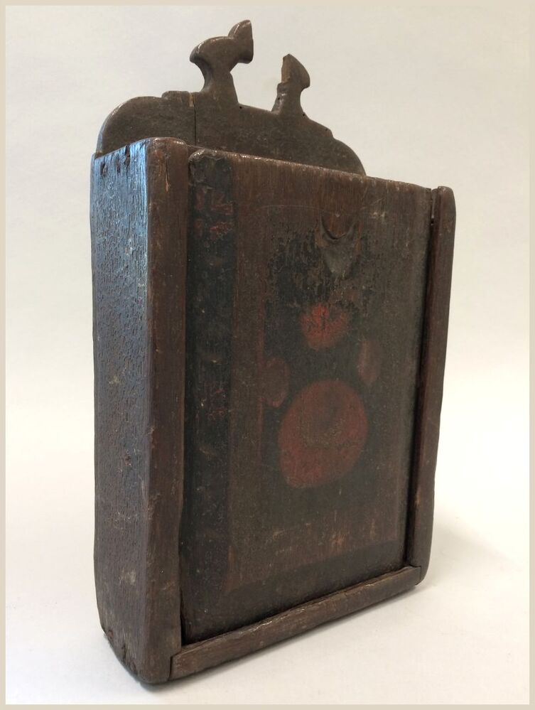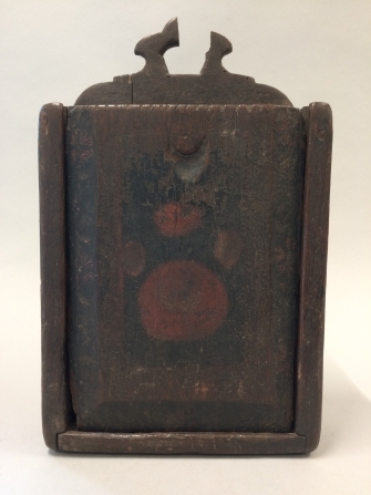 Houten schooltas met gebroken handvat, vervaagde versiering van rode bolvormen op de schuifdeksel
