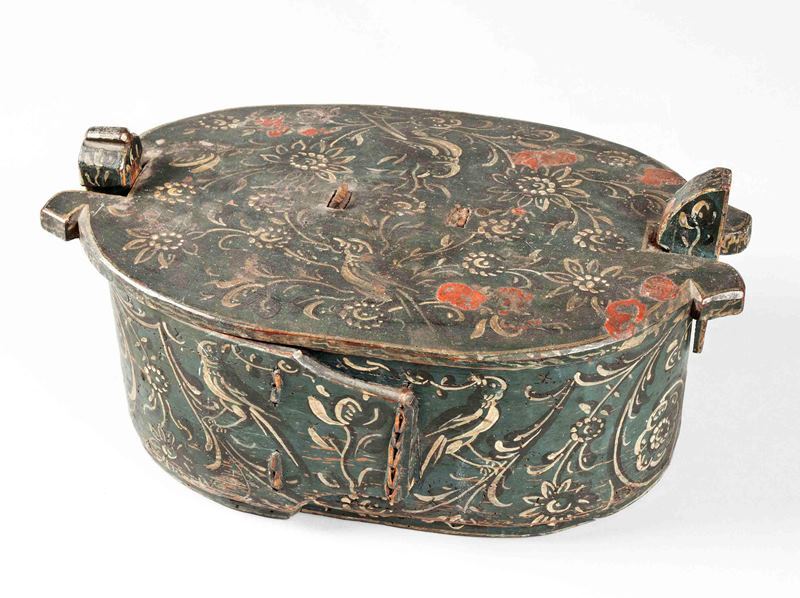 Kleine ovale houten budde met Hindeloper beschildering in blauw met wit