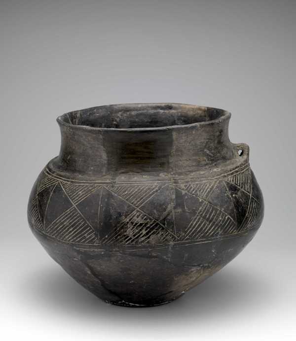 Bolvormige Ruinen-Wommels I pot van zwart gesmoord gepolijst aardewerk met een platte bodem en een hoge hals voorzien van een geometrische versiering