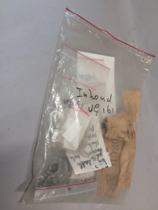 Dierlijke resten, uit flesvormige onversierde urn met ovale bodem