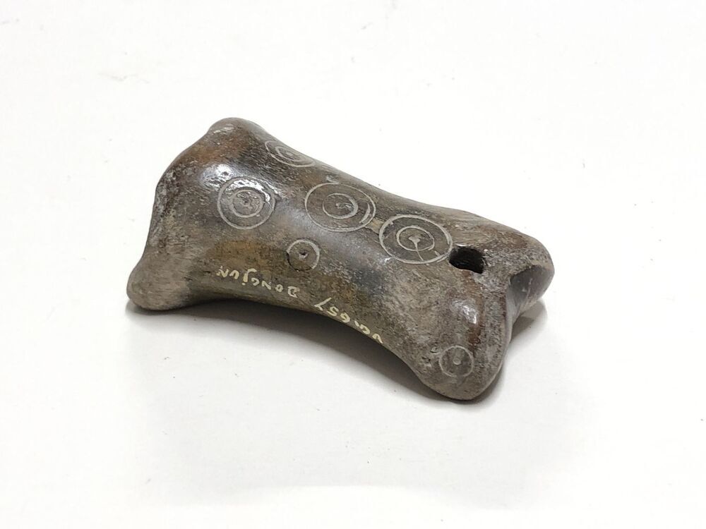 Runderkoot versierd met puntcirkels met een verticale doorboring aan één zijkant