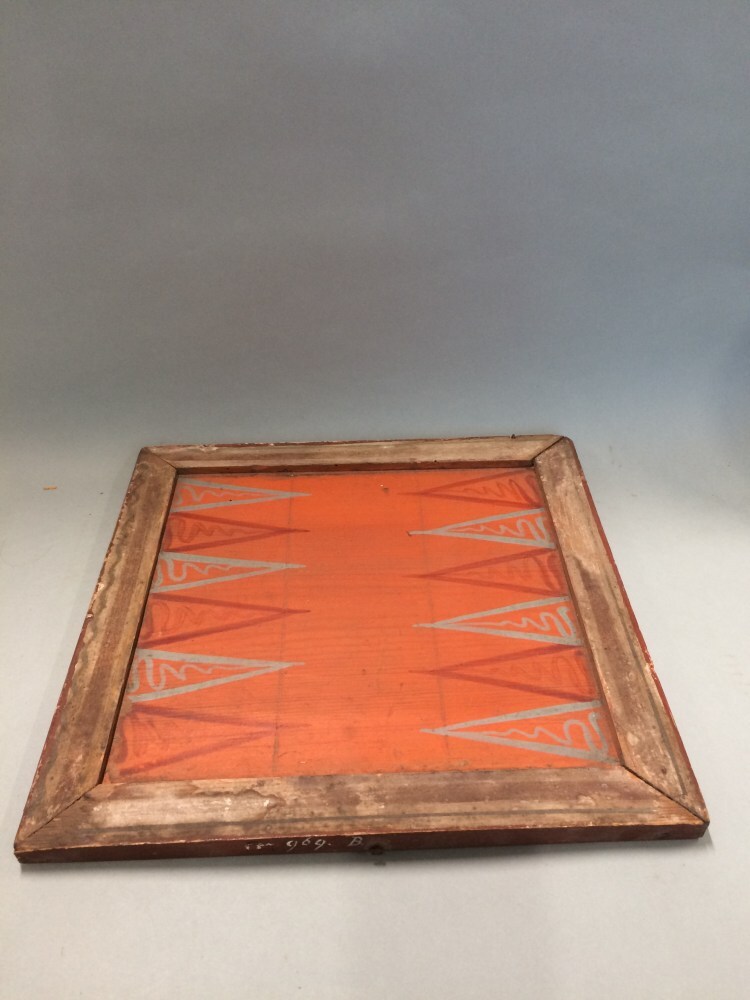 1 van 2 delen van een schaakbord met op de keerzijde een triktrakbord, van vurenhout, lichtgrijs/donkerrood/oranje beschilderd