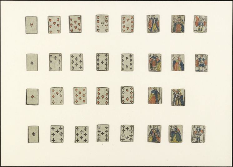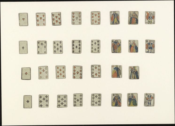 Kaarten die worden gemaakt in pakketten van een bepaald aantal en die zijn gemerkt om te worden gebruikt als spelonderdelen tijdens het spel; de merktekens of ontwerpen kunnen een bepaald kleur- of rangensysteem volgen of speciaal en meer specifiek zijn. (AAT-Ned) https://data.cultureelerfgoed.nl/term/id/cht/ec404b95-e035-4711-8179-7507d6407d4e