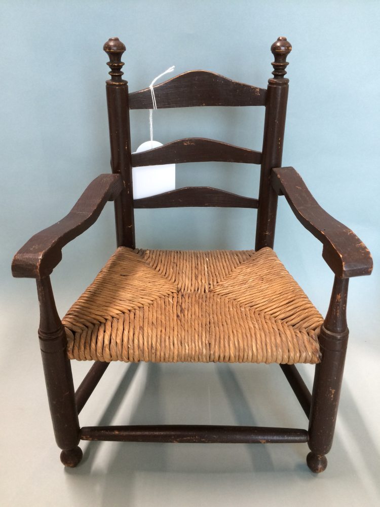 Miniatuur-knopstoel van bruingeverfd hout met biezen zitting, speelgoed