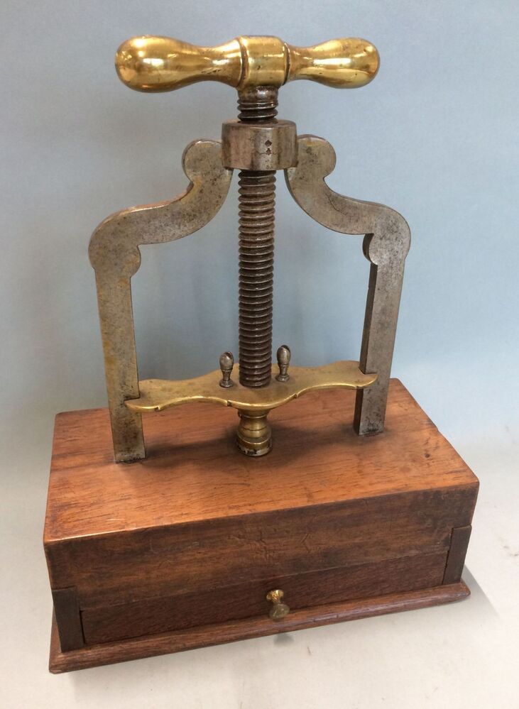 Stempelschroef met koperen stempel en eikenhouten onderstuk met lade