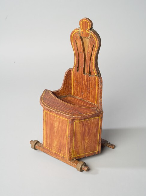 Eikenhouten poppenkakstoel op wielen, beschilderd met bruin en gele biezen