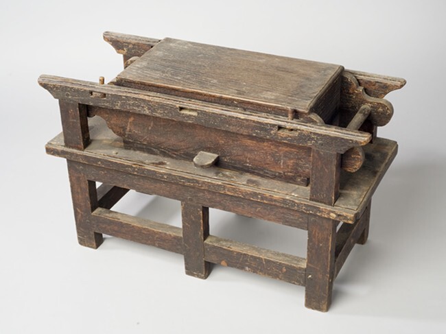 Miniatuur trekmangel van bruin beschilderd eikenhout, met 6 poten