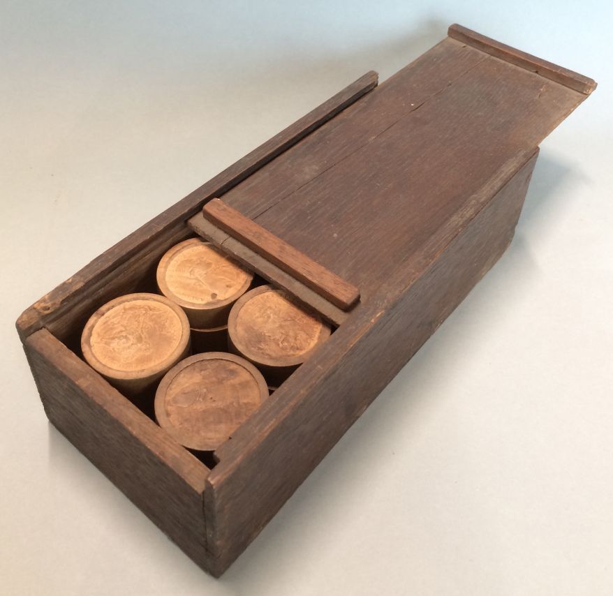 Doos met 32 damschijven van geperst hout, waarop voorstellingen