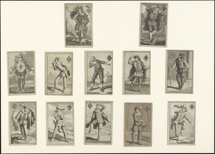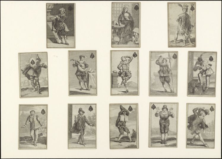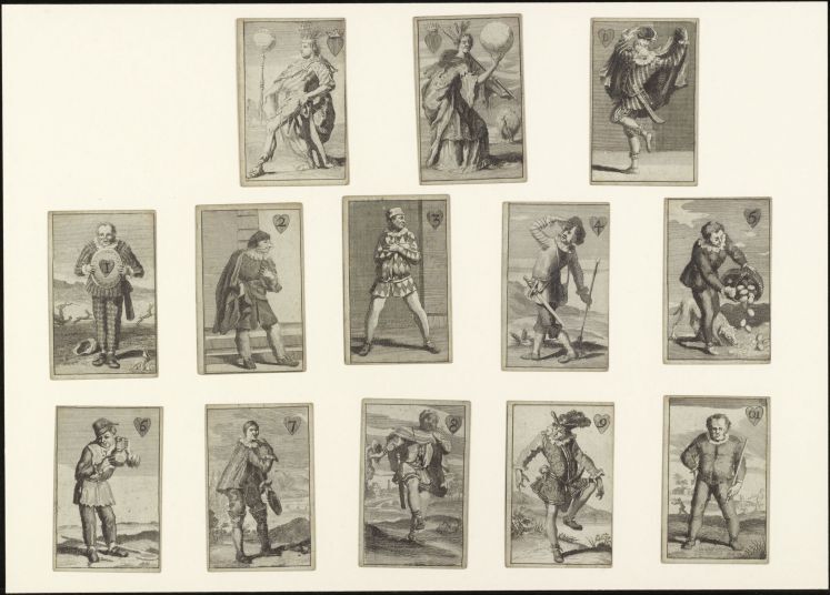 Kaarten die worden gemaakt in pakketten van een bepaald aantal en die zijn gemerkt om te worden gebruikt als spelonderdelen tijdens het spel; de merktekens of ontwerpen kunnen een bepaald kleur- of rangensysteem volgen of speciaal en meer specifiek zijn. (AAT-Ned)