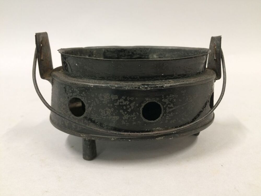 Komfoor, onderdeel van comfoor met theeketel van gelakt blikken theestoofje met hengsel